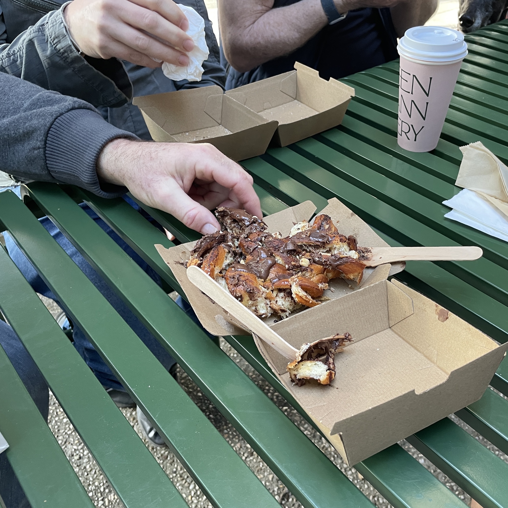 We quickly order coffees and, Lee and Pete, are once again in a sharing mood, buying a sticky chocolate and hazelnut babka, for us all to enjoy.