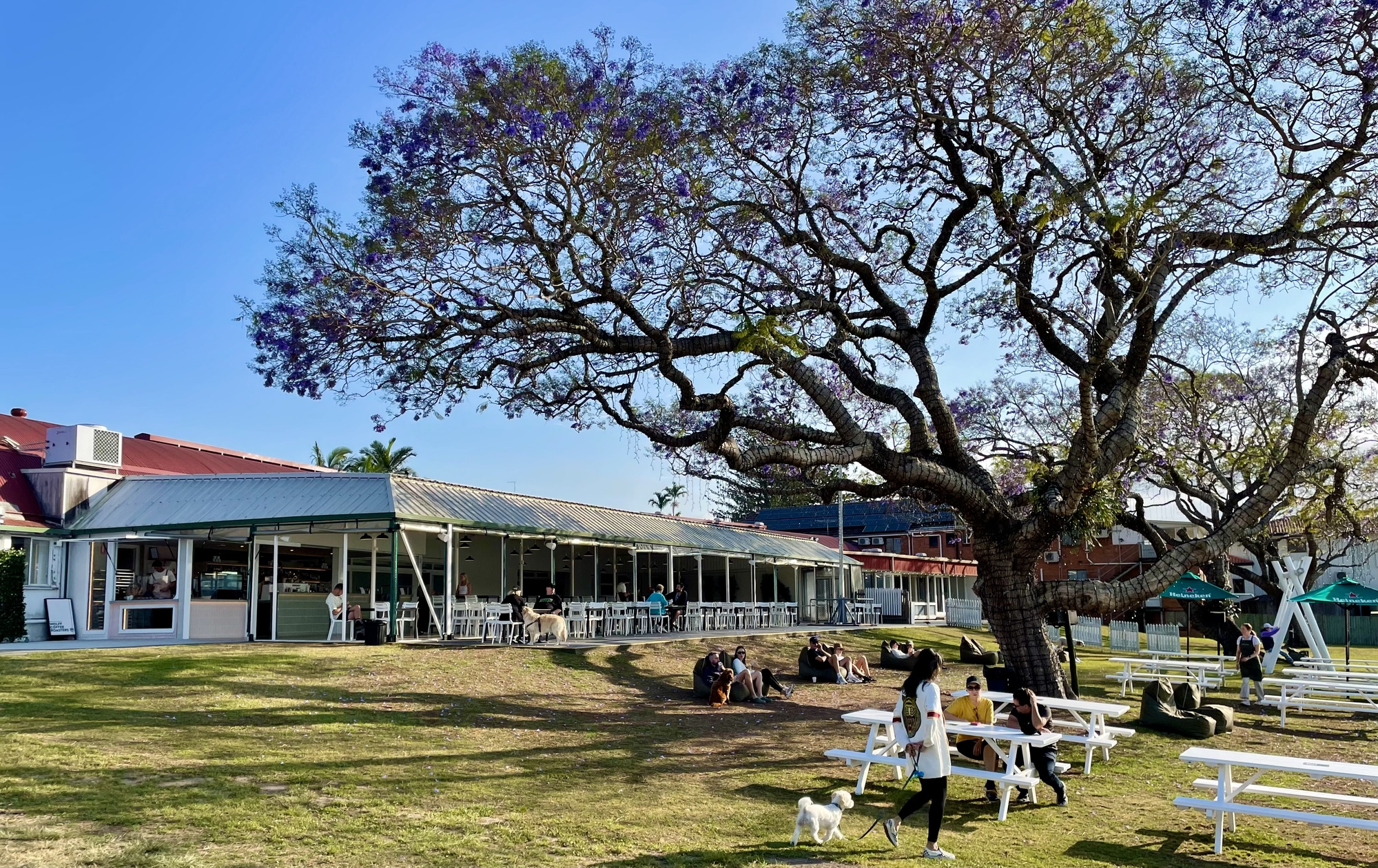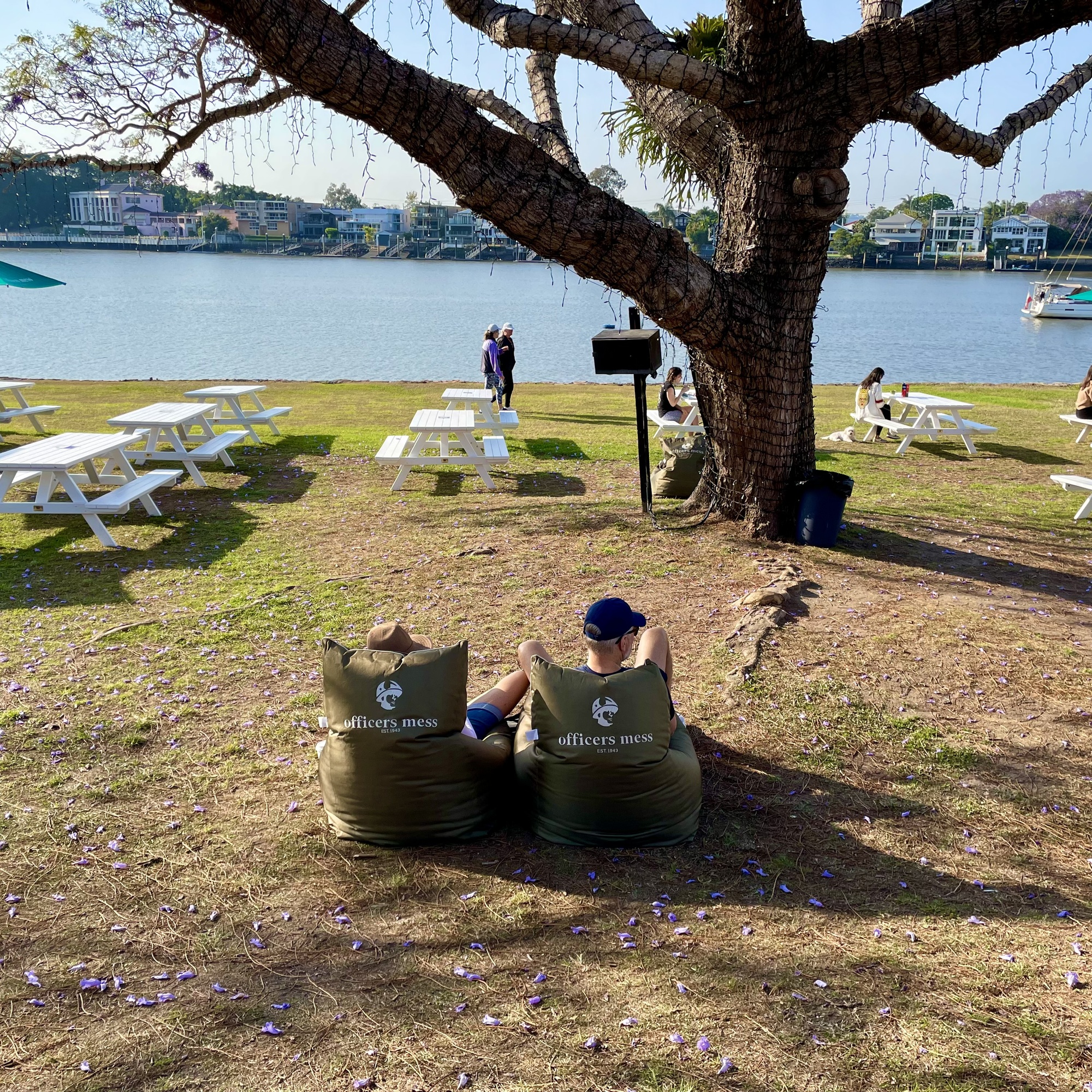 After eating, we move spots and sit under the imposing jacaranda tree... the undercover speaker music a tad loud for the eardrums of these fifty somethings!
