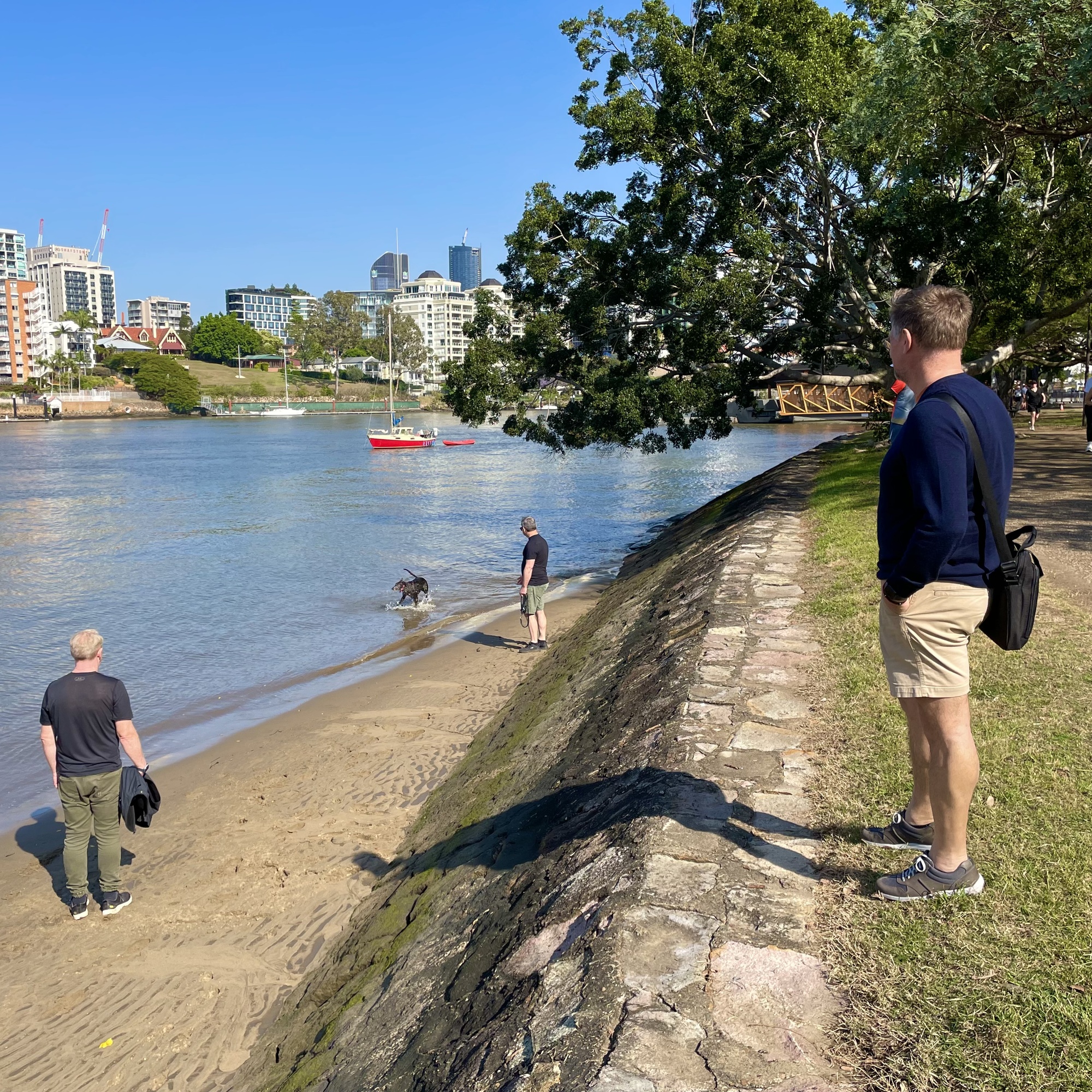 As the boat docks, Lee, Pete and Coco, are waiting to escort us along the river to our coffee venue, located next to the New Farm Bowls club.